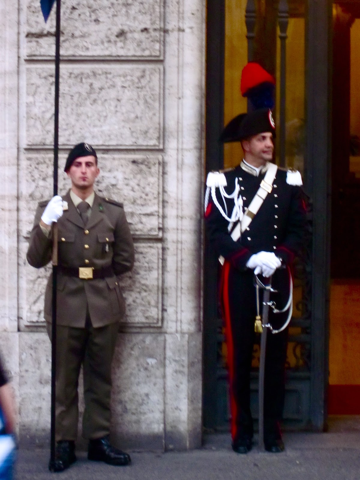 De hoeden van de onderstaande ambtenaren vielen mij ook zeer op. Ze lijken een beetje op die van de Thunderbirds. Ik weet niet precies wat voor functie deze mensen hadden maar het was me wel duidelijk dat ze niet tot de gewone politie behoorde. Zo kwamen de jongens linksonder massaal in een groep door de stad lopen (ik denk dat ze uit het leger kwamen) en stond de man rechts onder voor het werk paleis van de Italiaanse premier Berlusconi.